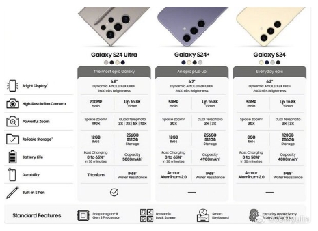 核心配置上,Galaxy S24系列全部采用第三代驍龍8平臺,支持IP68,這三款手機中,頂配版S24 Ultra會采用鈦合金邊框,S24/S24+則采用裝甲鋁合金邊框。