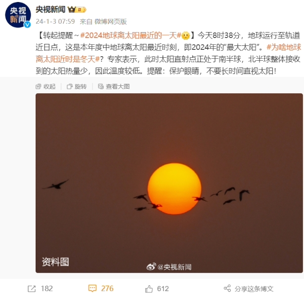 2024“最大太陽(yáng)”:今天是地球本年度離太陽(yáng)最近的一天 09:35:14