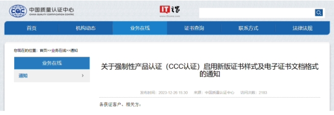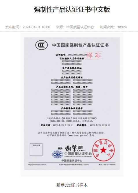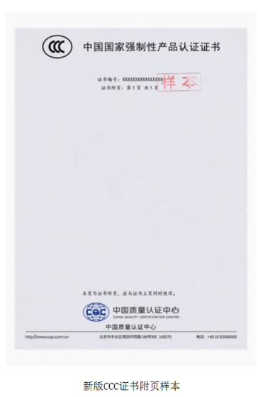根據《國家認監委關于完善強制性產品認證證書和標志管理的公告》(2023 年第 12 號)要求,自 2024 年 1 月 1 日起,中國質量認證中心強制性產品認證(CCC 認證)啟用新版證書樣式及電子證書文檔格式。
