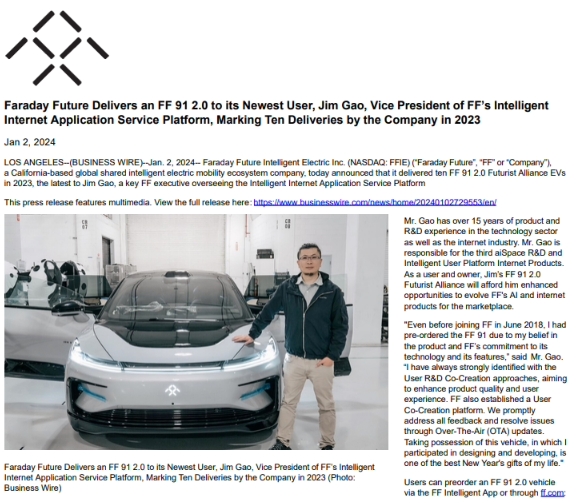 法拉第未來今日宣布,已經(jīng)向智能網(wǎng)聯(lián)應(yīng)用平臺全球副總裁 Jim Gao 交付了一輛 FF 91 2.0,這標(biāo)志著該公司在 2023 年已經(jīng)交付了十輛車。