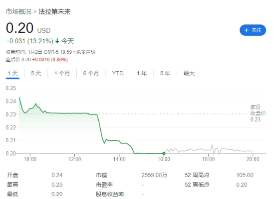 值得一提的是,法拉第未來在 12 月 28 日收到了納斯達克關(guān)于退市或不符合繼續(xù)上市規(guī)則或標(biāo)準(zhǔn)的通知。法拉第未來美股為 0.20 美元,市值僅 2559.60 萬美元。