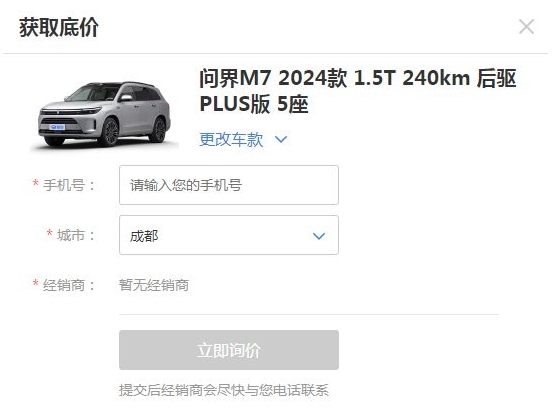 紅星資本局在懂車帝上搜索問界和智界車型,發現點擊“獲取底價”后,提示“該車型經銷商暫未入駐平臺,實際報價請詳詢當地經銷商。”汽車之家上,問界和智界車型的“詢底價”按鈕變灰,經銷商參考價顯示為“暫無”。易車網上,選擇問界和智界車型獲取底價,“立即詢價”按鈕變灰,顯示暫無經銷商。