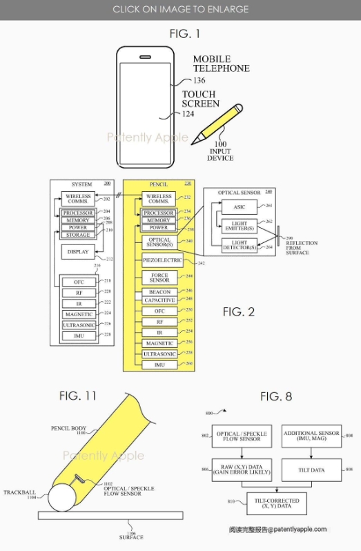 根據專利描述,新款 Apple Pencil 配有光學傳感器,可用于在不具備觸摸功能的表面上進行交互。