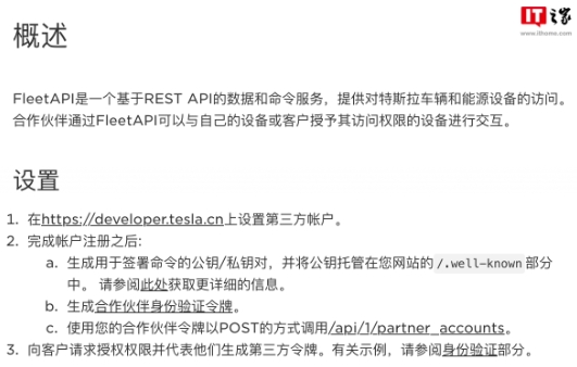 據官方介紹,FleetAPI 是一種 RESTful 數據和命令服務,提供對特斯拉車輛和能源設備的訪問權限,合作伙伴可以與自己的設備或授予客戶訪問權限的設備進行交互。
