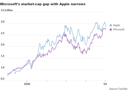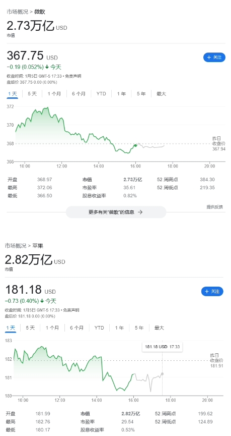 目前微軟公司市值為 2.73 萬(wàn)億美元(備注:當(dāng)前約 19.57 萬(wàn)億元人民幣),蘋果公司市值 2.82 萬(wàn)億美元(當(dāng)前約 20.22 萬(wàn)億元人民幣),兩者僅約 1000 億美元(當(dāng)前約 7170 億元人民幣)。