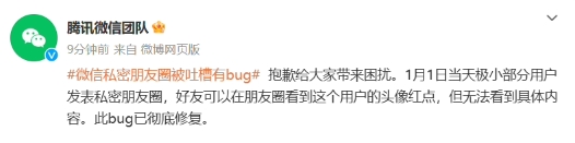 網絡上有人吐槽微信私密朋友圈有 bug,騰訊微信團隊發文致歉,并表示此 bug 已徹底修復。