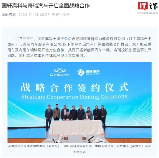 國軒高科全資子公司合肥國軒高科動力能源有限公司(以下簡稱合肥國軒)與奇瑞汽車股份有限公司(以下簡稱奇瑞汽車)簽署戰略合作協議。雙方擬在乘用車及商用車領域展開全方位合作,共同開拓新能源汽車市場。