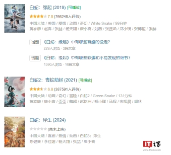 電影《白蛇:緣起》于 2019 年上映,目前豆瓣評(píng)分 7.8;《白蛇:青蛇劫起》于 2021 年上映,目前豆瓣評(píng)分 6.8。