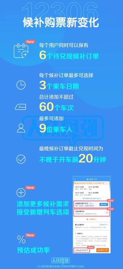 四是臨時新增旅客列車席位優先配售給已提交候補訂單的旅客。旅客在提交候補訂單時,可選擇接受購買符合出行需求的新增旅客列車車票,如鐵路部門臨時新增旅客列車,在車票起售時,鐵路 12306 將自動優先配售給已提交候補訂單的旅客,旅客無需人工查詢增開列車信息再購票。