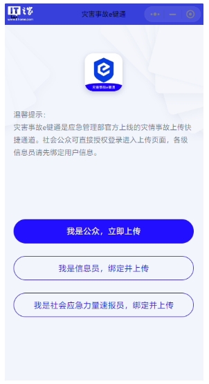 目前,災害事故 e 鍵通提供公眾、信息員、社會應急力量速報員三種身份供用戶選擇,社會公眾可直接授權登錄進入上傳頁面,各級信息員需要先綁定用戶信息。