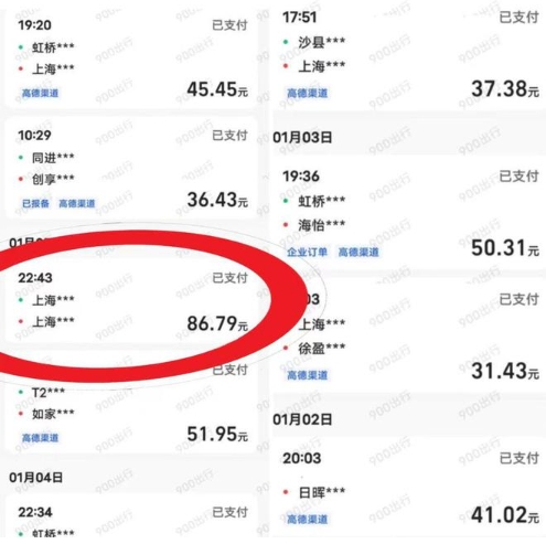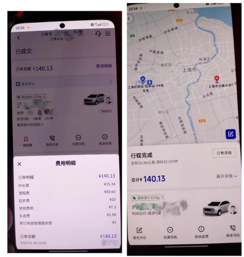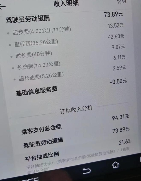 還沒(méi)等體驗(yàn)到所謂的“優(yōu)惠價(jià)”,一次與乘客閑聊中,曹師傅發(fā)現(xiàn),平臺(tái)抽傭比例極高,且金額與乘客實(shí)付對(duì)不上:1 月 5 日 22 時(shí)多,他在平臺(tái)接到一個(gè)從虹橋火車站去往北蔡中學(xué)的“大單”,全程 36.86 公里。到達(dá)目的地后,他隨口打聽(tīng)了乘客支付的訂單價(jià)才覺(jué)不對(duì)。“乘客實(shí)付 140.13 元,但在平臺(tái)的司機(jī)端顯示乘客實(shí)付 116.92 元,扣完傭金到手只有 86.79 元,抽成比例高達(dá) 38%!中間這 20 多元去哪兒了?”