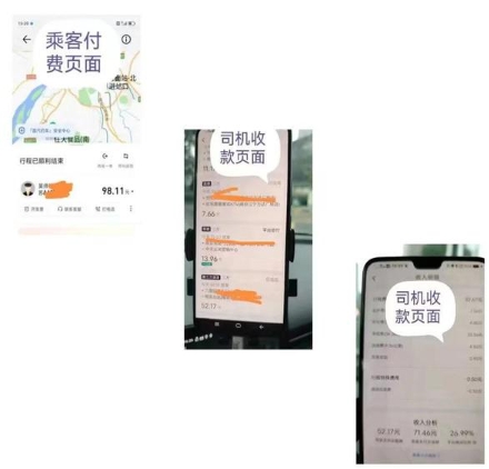 東南大學(xué)交通法治與發(fā)展研究中心執(zhí)行主任、中國(guó)城市公共交通協(xié)會(huì)網(wǎng)約車分會(huì)會(huì)長(zhǎng)顧大松曬出的賬單截圖顯示,一位乘客打車,訂單結(jié)束實(shí)付 98.11 元。但蹊蹺的是,同一段行程,司機(jī)端卻顯示乘客付費(fèi)為 71.46 元,司機(jī)實(shí)收 52.17 元。中間憑空消失了 26.65 元,超過(guò)司機(jī)實(shí)收的一半。