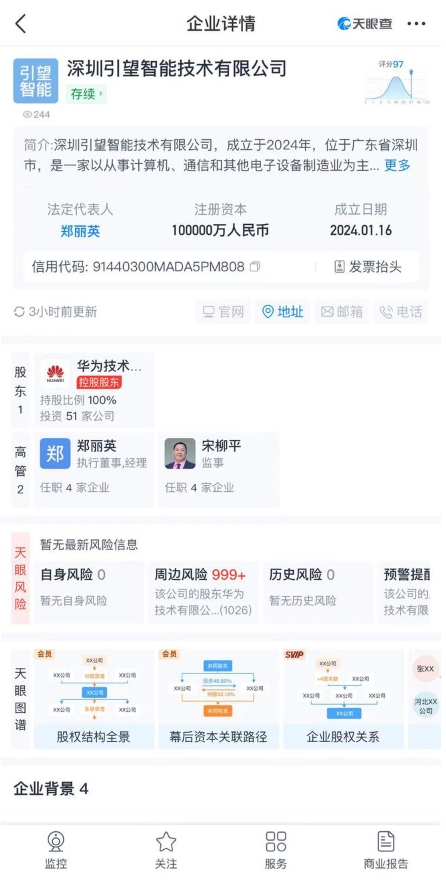 天眼查信息顯示,深圳引望智能技術有限公司于 1 月 16 日成立,注冊資本 10 億,法定代表人為鄭麗英。該公司即為華為車 BU 成立的新公司。