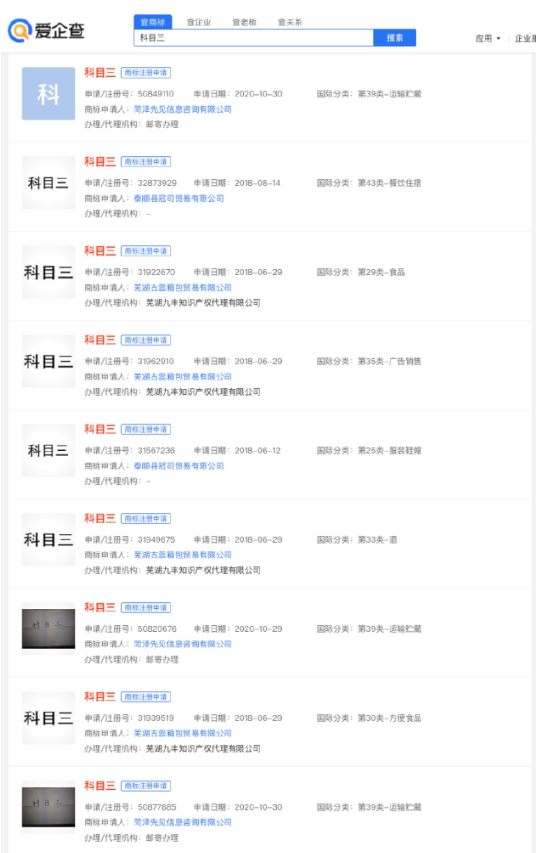 近日,“多地春晚彩排現科目三”引發網友關注。其中傳播度最廣的視頻是趙本山弟子宋曉峰在安徽臺錄制春晚小品時跳科目三舞蹈片段。1月18日,小品導演兼演員高海龍表示,小品中設置宋曉峰跳科目三是劇情需要,并不是為了加而加。愛企查App顯示,“科目三”已被多家企業申請注冊商標,國際分類涉及運輸貯藏、餐飲住宿、食品、廣告銷售、服裝鞋帽等,申請人包括位于蕪湖、菏澤等地的箱包貿易企業、信息咨詢公司等。上述商標最早申請于2018年,絕大多數已被駁回。