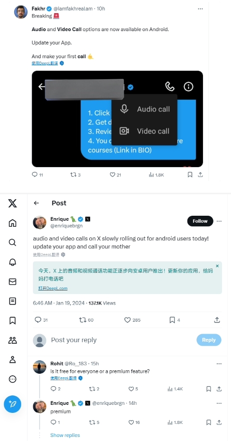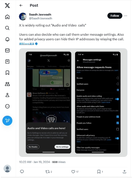 馬斯克在去年 10 月上線 iOS 端的 X 音視頻通話功能時曾表示,當時推出的仍是測試版本。