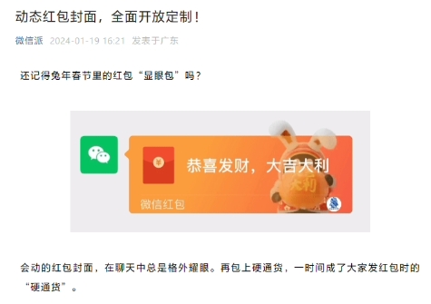 據“微信派”,微信動態紅包封面現已全面開放定制。官方表示,作為紅包封面升級樣式的動態封面,其創意不再受限于一張圖片,定制方可以通過動態封面講述“完整故事”。