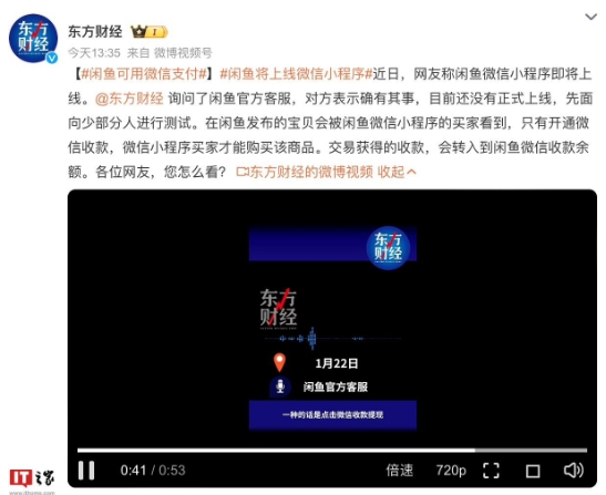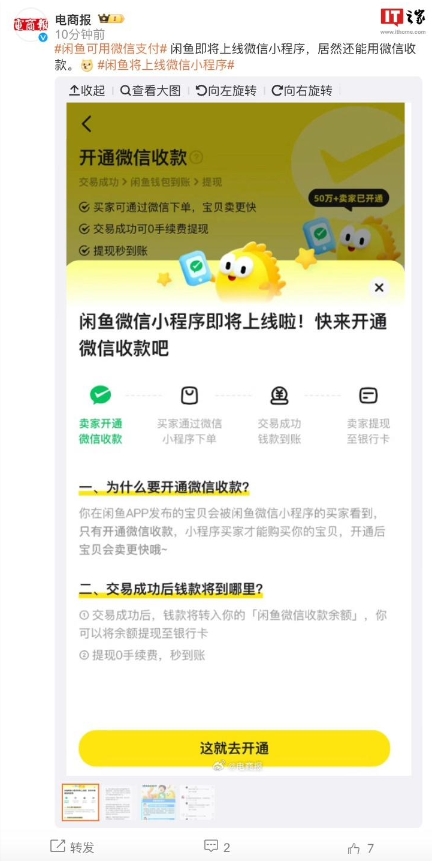 微博出現“閑魚可用微信支付”話題,流傳截圖展示有“閑魚微信小程序即將上線,快來開通微信收款”字樣。