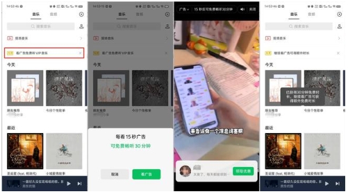 具體路徑:小程序下拉頁面-音樂-「看廣告免費聽VIP音樂活動」橫幅-看廣告即可。