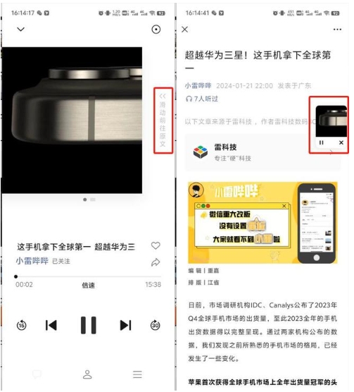 音頻播放器新增滑動操作,手指按住文章封面向左滑動,震動反饋后松手就可以前往原文。