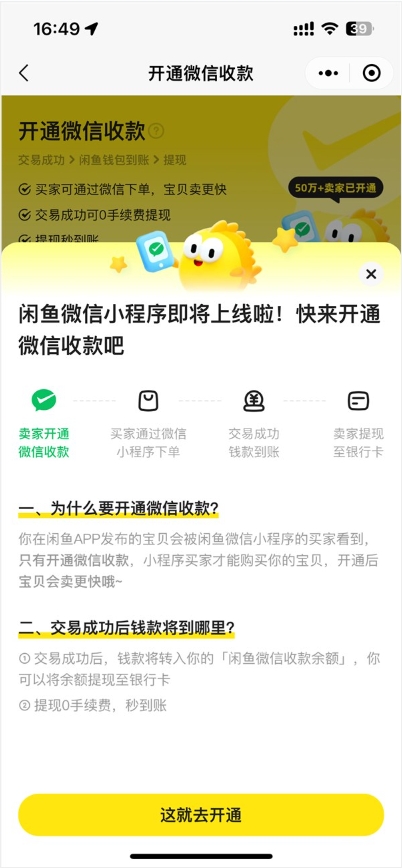 根據開通微信收款頁面顯示,交易成功后,錢款將轉入商家閑魚微信收款余額。商家可將此余額提現至銀行卡,并聲稱0手續費,秒到賬。