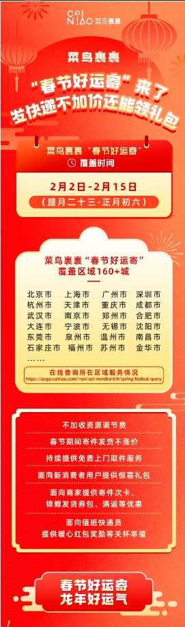 菜鳥官方公眾號今晚發文宣布,菜鳥裹裹業務 2024 年春節期間(2 月 2 日-2 月 15 日,臘月二十三-正月初六),在國內超 160 個城市正常提供快遞服務。