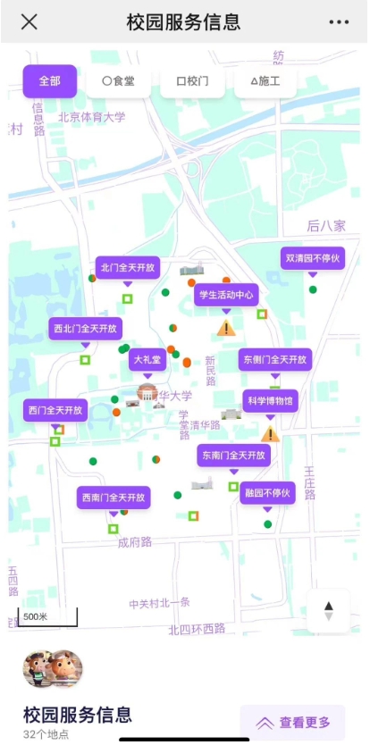社會公眾入校前后可在清華大學官方網站下載使用校園地圖,按照地圖上的圖示指引,規劃游學路線。此外,“清華后勤”企業號底部菜單欄“服務平臺”頻道嵌入【行在清華】板塊,新增【服務地圖】欄目,校園服務信息可以一鍵獲得。