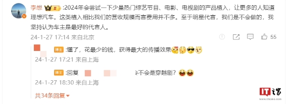 理想汽車(chē) CEO 李想發(fā)文,表示不會(huì)請(qǐng)明星代言,堅(jiān)持認(rèn)為車(chē)主是最好的代言人;2024 年會(huì)嘗試一下少量熱門(mén)綜藝節(jié)目、電影、電視劇的產(chǎn)品植入,這類(lèi)植入相比營(yíng)收規(guī)模而言費(fèi)用并不多。