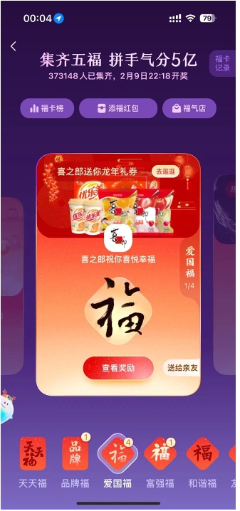 與往年一樣,今年五福卡依然是愛(ài)國(guó)福、敬業(yè)福、和諧福、友善福、富強(qiáng)福,集齊后就可在2月9日22:18開(kāi)獎(jiǎng)。
