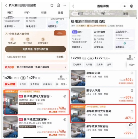 飛豬App端(左)和小程序端(右)預定杭州某酒店豪華城景特大床客房價格不同