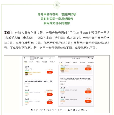 北京市消協通報案例中顯示,部分平臺存在新、老用戶賬號同時購買同一商品或服務,實際成交價不同現象。體驗人員分別通過新、老用戶賬號同時在飛豬旅行app上預訂同一日期“宋城千古情(貴賓票)+靈隱飛來峰(大門票)成人票”時,老用戶賬號顯示價格360元,享受飛豬紅包10元,優惠后價格為350元;而新用戶賬號顯示價格355元,不享受任何優惠,新、老用戶賬號顯示價格不同,享受優惠也不同。