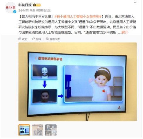 北京通用人工智能研究院近日研發出了一款名為“通通”的通用人工智能小女孩。這款人工智能系統與之前的模型有所不同,它并不是由傳統的數據驅動,而是采用了價值與因果驅動的方法。據官方介紹,“通通”的智力水平相當于三歲兒童的智力水平,在某些特殊任務領域甚至超過了成人。