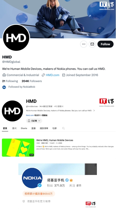 HMD Global 目前已經正式“去諾基亞化”,原“NokiaMobile”X 平臺 / YouTube 官方賬號均已經改名為“HMD”,不過微博平臺暫未更名。