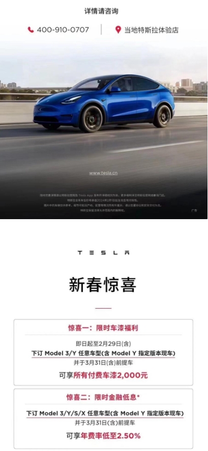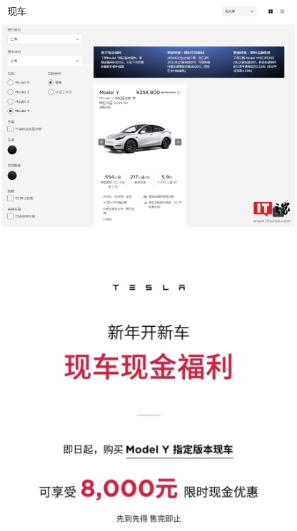 此外,特斯拉官網更新,現推出了“新春驚喜”活動,購買特定版本 Model Y 現車可獲得現金優惠 8000 元,而且還能花 2000 元選配剛推出的“快銀”等新車漆。