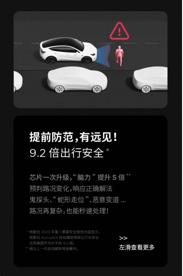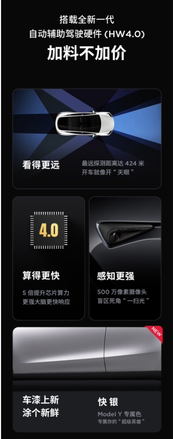升級 HW 4.0 之后,特斯拉 Model Y 將擁有“5 倍提升芯片算力”,最遠探測距離可達 424 米,而且支持 500 萬像素攝像頭,從而實現“9.2 倍出行安全”,支持自動輔助導航駕駛、自動輔助轉向、自動緊急制動、側撞預警、前撞預警、自動遠光燈等功能。