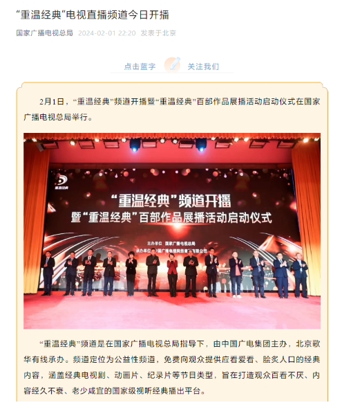 據國家廣播電視總局官方公眾號,“重溫經典”頻道開播暨“重溫經典”百部作品展播活動啟動儀式,于今日在國家廣播電視總局舉行。
