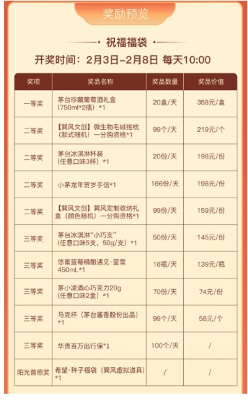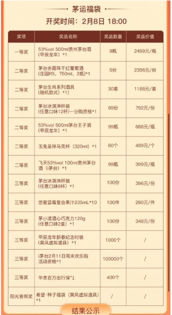 2月8日18時,擁有“祝福”福袋的用戶可參與“茅運”福袋開獎,有機會獲得大獎,包括貴州茅臺酒(甲辰龍年)系列酒、悠蜜藍莓復(fù)合果汁、茅臺生肖系列酒具等。