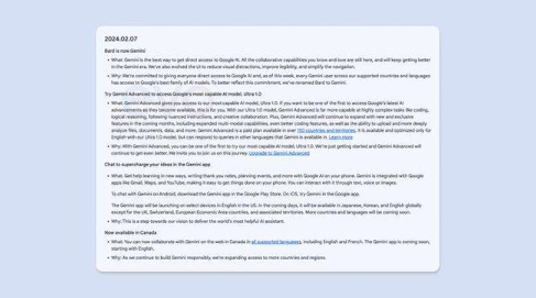根據(jù)文件,Gemini Advanced 將允許用戶訪問(wèn) Gemini 的 Ultra 1.0 模型,該模型在“編碼、邏輯推理、遵循細(xì)致指令和創(chuàng)意協(xié)作等高度復(fù)雜任務(wù)方面表現(xiàn)出色”。其初期版本將在超過(guò) 150 個(gè)國(guó)家 / 地區(qū)提供,并針對(duì)英語(yǔ)進(jìn)行優(yōu)化。文件還顯示,Gemini 將隨此次更新擴(kuò)展到加拿大地區(qū)。