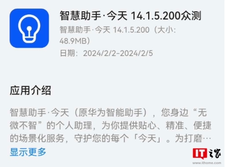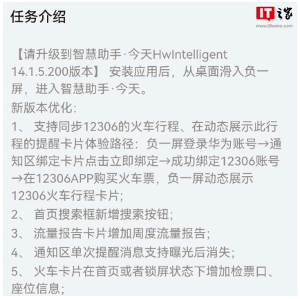 華為昨天為智慧助手推送了 14.1.5.200 眾測更新,包體積為 48.9MB,主要改進了 12306 火車信息同步功能。