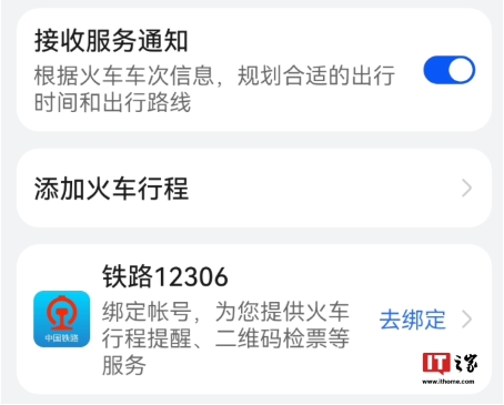 在更新相關版本后,用戶可以在智慧助手應用中綁定 12306 賬號,之后即可在系統負一屏自動同步 12306 火車行程,相對于此前“讀取短信信息同步行程”更方便,在綁定后,用戶也可以在設置中自由解綁更換賬號。
