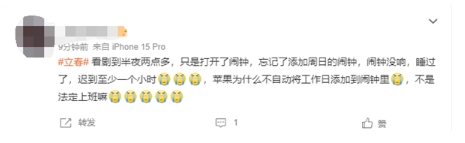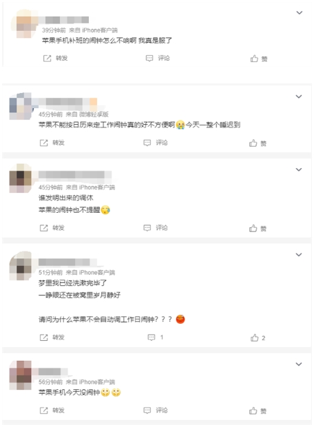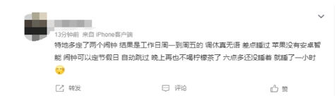 “特地多定了兩個鬧鐘,結果是工作日周一到周五的,調休真無語,差點睡過,蘋果沒有安卓智能,鬧鐘可以定節假日”