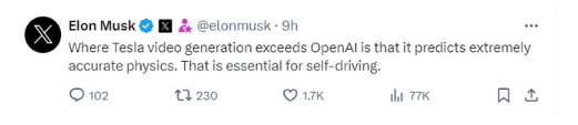 在一條回復(fù)用戶的評(píng)論中馬斯克指出,“特斯拉視頻生成超越OpenAI的地方在于,它預(yù)測(cè)了極其精準(zhǔn)的物理場(chǎng)景,這對(duì)自動(dòng)駕駛至關(guān)重要。”