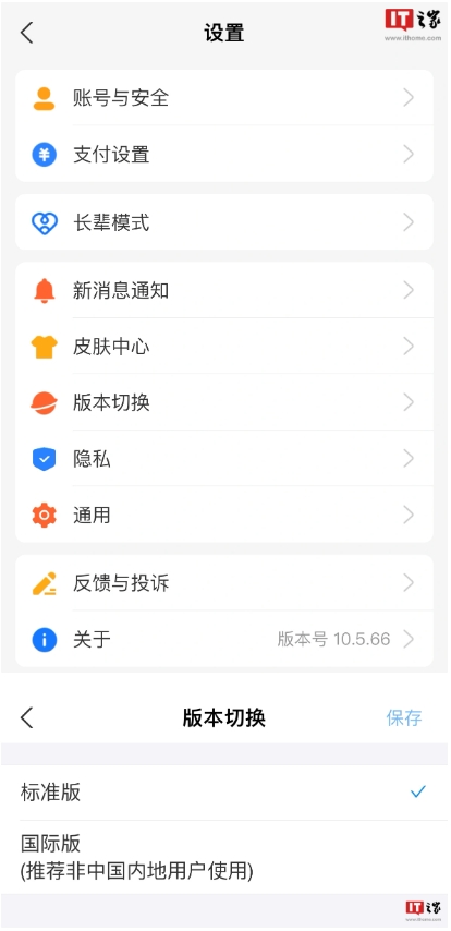 不過支付寶 App 10.5.66 版本,發(fā)現(xiàn)設(shè)置中相關(guān)“長輩模式”依然存在,而“版本切換”按鈕中顯示為可切換“標準版”及“國際版”。