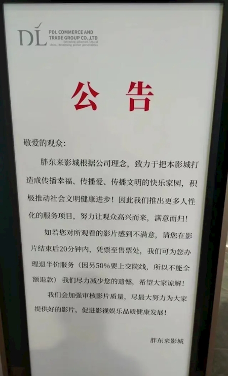 影城公告牌上寫到,如果對影片不滿意,可以在看完后20分鐘內(nèi),去售票處退款50%,并解釋另外50%要上交院線,所以不能全額退款。