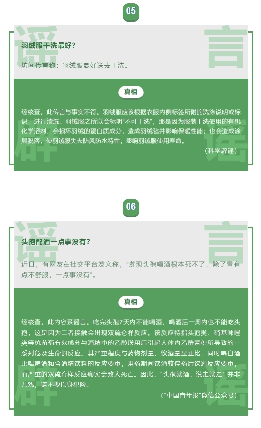 針對“頭孢配酒一點事沒有”,經“中國青年報”微信公眾號核查,此內容系謠言。吃完頭孢 7 天內不能喝酒,喝酒后一周內也不能吃頭孢,這是因為二者接觸會出現雙硫侖樣反應。該反應特指頭孢類、硝基咪唑類等抗菌藥有效成分與酒精中的乙醇聯用后引起人體內乙醛蓄積所導致的一系列危及生命的反應。其嚴重程度與藥物劑量、飲酒量呈正比,同時喝白酒比喝啤酒和含酒精飲料的反應要重,用藥期間飲酒較停藥后飲酒反應要重,而嚴重的雙硫侖樣反應確實會致人死亡。因此,“頭孢就酒,說走就走” 并非兒戲,請不要以身犯險。