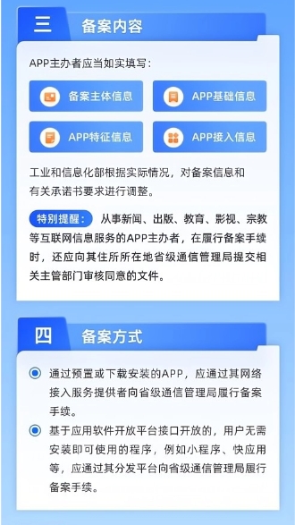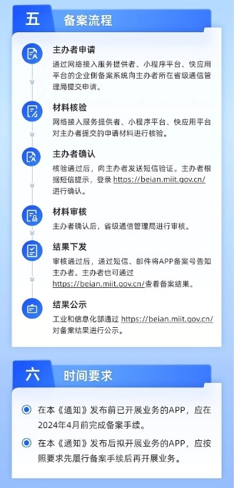 2023 年 9 月至 2024 年 3 月底,《通知》發(fā)布前開展業(yè)務(wù)的 App 向其住所所在地省級通信管理局履行備案手續(xù)。2024 年 4 月至 2024 年 6 月底,電信主管部門將組織對 App 備案情況開展監(jiān)督檢查,對仍未履行備案手續(xù)的 App 依法進(jìn)行處置。