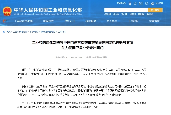 工信部官方表示,中國電信集團有限公司已獲得國際電信聯盟批準,取得 E.164 碼號(882)52 及 E.212 碼號(901)09,分別作為天通衛星業務的用戶撥號碼號和網絡識別碼號,這是我國電信企業首次獲得用于衛星通信業務的國際電信碼號資源。