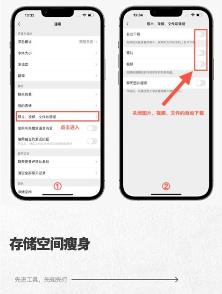 除了常規的微信內存清理和聊天記錄電腦備份,還可以關閉“自動下載”功能,防止APP自動下載視頻、照片等大文件。
