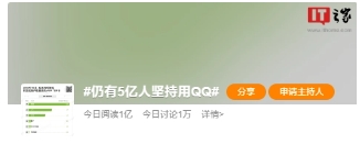#仍有 5 億人堅持用 QQ#這一話題沖上了微博熱搜第一名。該話題閱讀量達到 1 億,討論數量達到 1 萬。