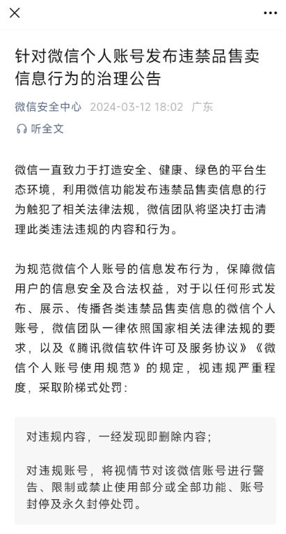 微信安全中心宣布,對于以任何形式發布、展示、傳播各類違禁品售賣信息的微信個人賬號,微信團隊一律依照國家相關法律法規的要求,以及《騰訊微信軟件許可及服務協議》《微信個人賬號使用規范》的規定,視違規嚴重程度,采取階梯式處罰: