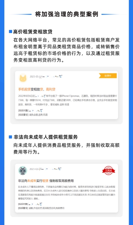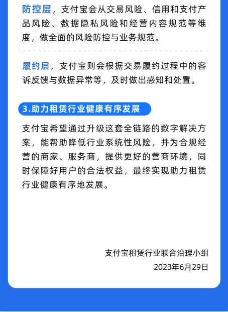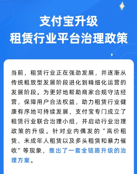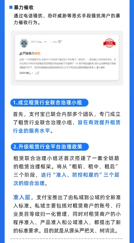 2023 年 7 月,支付寶更新發布《支付寶租享行業管理規范》,規定租賃商品年總租金和轉銷售金額之和不能高于商品官網價格的 130%。同年 6 月,支付寶還成立了租賃行業聯合治理小組,針對業內偶發的“高價租賃、未成年人租賃以及多頭租賃和暴力催收”等現象,推出了一套全鏈路升級的治理方案。官方稱一旦發現商家違規行為,就立即要求商家進行整改,并對小程序采取警告、搜索全局屏蔽等處置。